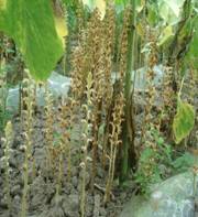 列當(dāng)屬一種根寄生植物,列當(dāng)種子在土壤中接觸到向日葵的根時,受根部分泌物的刺激而萌發(fā),形成吸根(盤)深入到寄主根部吸收營養(yǎng)。同時在根外發(fā)育成膨大部分,向上形成花莖,向下形成大量吸盤,每株可形成5-10萬粒種子。每年在7月上旬陸續(xù)萌發(fā)出土。重茬和低溫地發(fā)病較重。一般被列當(dāng)寄生后的向日葵,株高降低10%,莖粗減少4.4%~33.3%,花盤直徑縮小23%~36%。種子飽滿度降低36.4%。