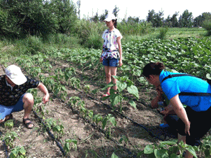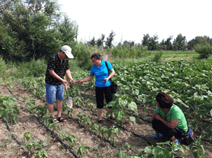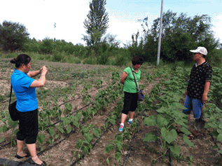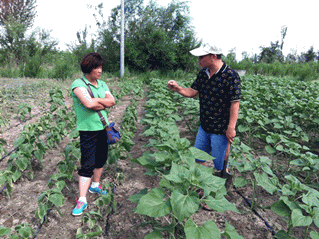 圖9:三位專家在地里察看 圖10:科技特派員認真聽取公司劉總講解列當(dāng)?shù)奈:头乐未胧?/span>