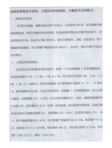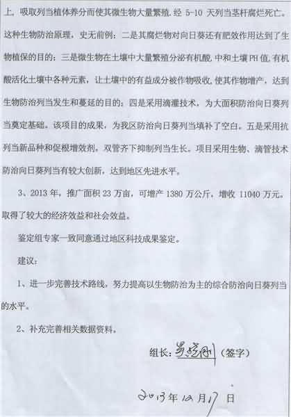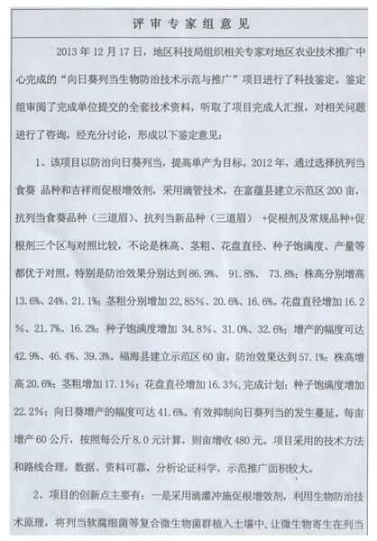 下面是新疆阿勒泰地區(qū)農(nóng)業(yè)技術(shù)推廣中心用成都華宏生態(tài)農(nóng)業(yè)科技有限公司生產(chǎn)的微生物菌肥成功攻克寄生在向日葵上的列當(dāng)后,阿勒泰地區(qū)科技局對(duì)其成果的評(píng)審鑒定結(jié)果:具有先進(jìn)性、創(chuàng)造性、成熟性、科學(xué)性,向日葵增產(chǎn)達(dá)到40%,其防治技術(shù)填補(bǔ)了阿勒泰地區(qū)空白。