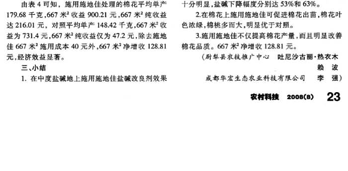《農(nóng)村科技》2008年第8期 “施地佳”鹽堿改良劑在棉花地施用效果試驗(yàn)