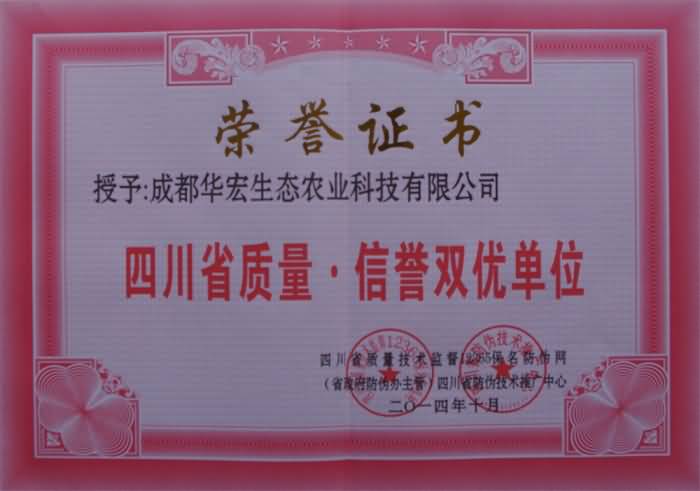 我公司獲四川省2014質(zhì)量、信譽雙優(yōu)單位 2014/11/6 華宏生物 成都華宏生態(tài)農(nóng)業(yè)科技有限公司 獲四川省2014質(zhì)量、信譽雙優(yōu)單位 四川省質(zhì)量技術(shù)監(jiān)督12365保名防偽網(wǎng)、(省政府防偽辦主管)四川省防偽技術(shù)推廣中心授予成都華宏生態(tài)農(nóng)業(yè)科技有限公司“四川省質(zhì)量、信譽雙優(yōu)單位”榮譽。
