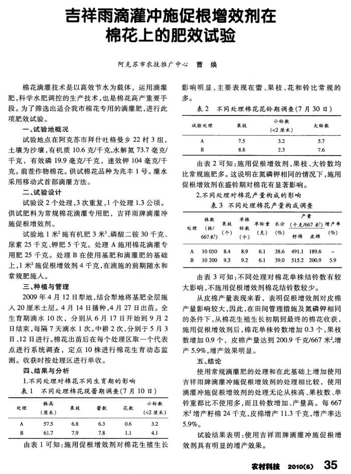 《農(nóng)村科技》2010年第6期 “吉祥雨”滴灌沖施促根增效劑在棉花上的肥效實(shí)驗(yàn)
