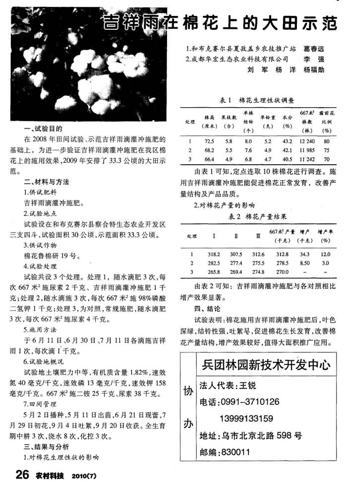 《農(nóng)村科技》2010年第7期 “吉祥雨”在棉花上的大田示范