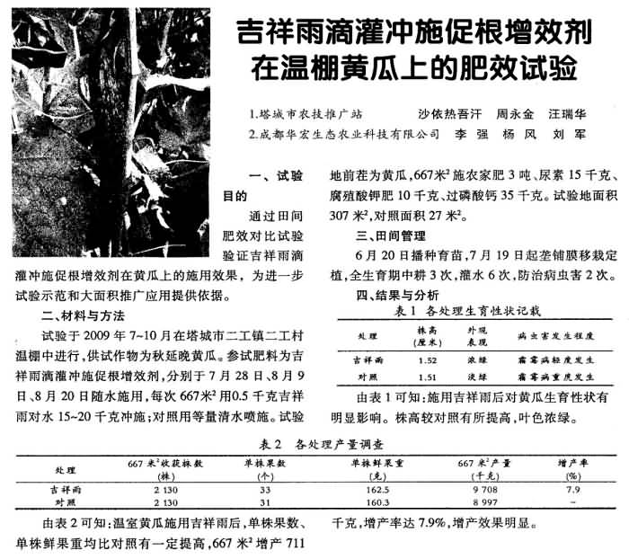 《農(nóng)村科技》200年第10期 “吉祥雨”滴灌沖施促根增效劑在溫棚黃瓜上的肥效試驗(yàn)
