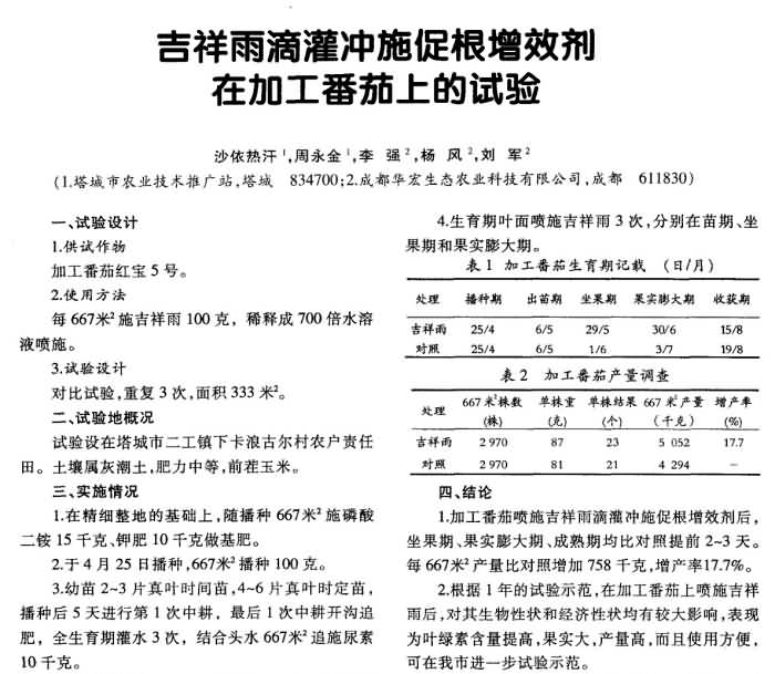 《農(nóng)村科技》2011年第1期 “吉祥雨”滴灌沖施促根增效劑在加工番茄上的試驗
