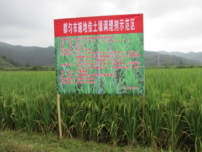 2014年農(nóng)業(yè)部全國(guó)農(nóng)技推廣服務(wù)中心安排在貴州省都勻市土肥站進(jìn)行酸化土壤調(diào)理的試驗(yàn),試驗(yàn)結(jié)果顯示“施地佳”酸化土壤調(diào)理劑第一年在當(dāng)?shù)刂饕Z食作物水稻上的試驗(yàn)成功,實(shí)驗(yàn)結(jié)果土壤酸度降低,土壤容重降低,稻谷增產(chǎn)幅度達(dá)到6%以上,我們的試驗(yàn)計(jì)劃是三年定點(diǎn)示范,為我們的土壤改良總結(jié)一套成功的可行的實(shí)施方案。