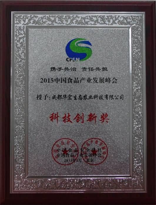 附:中國食品產(chǎn)業(yè)發(fā)展峰會授予成都華宏生態(tài)農(nóng)業(yè)科技有限公司的“科技創(chuàng)新”獎牌