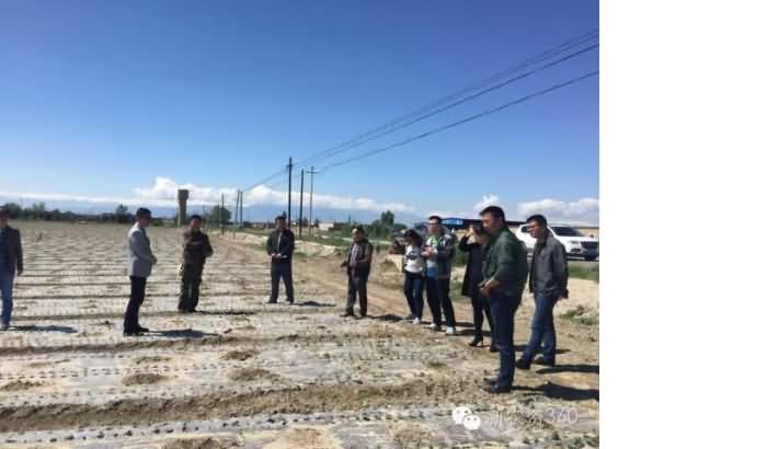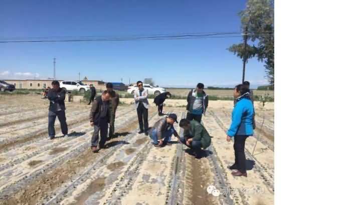 圖片說明1:與89團生產科領導,到實驗地察看今年棉苗情況,由于今年氣溫低,雨水多,棉苗普遍長勢差,病害發(fā)生嚴重,死苗現(xiàn)象發(fā)生,成都華宏實驗示范地棉苗長勢正常,未發(fā)現(xiàn)死苗現(xiàn)象。