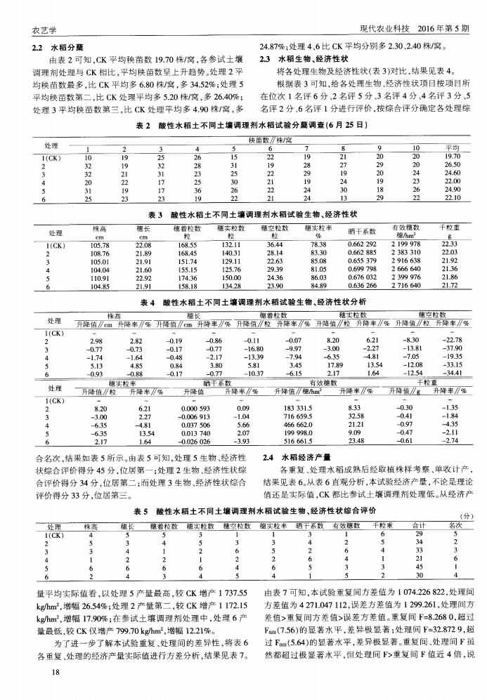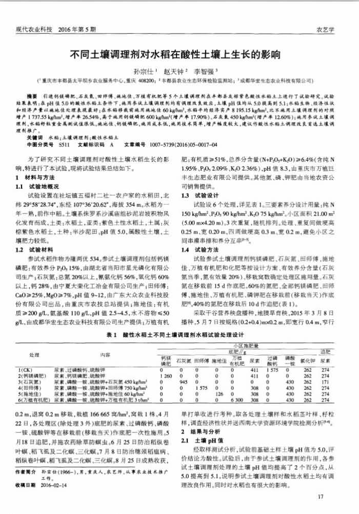 《現(xiàn)代農(nóng)業(yè)科技》2016年 第5期不同土壤調(diào)理劑對(duì)水稻在酸性土壤上生長(zhǎng)的影響