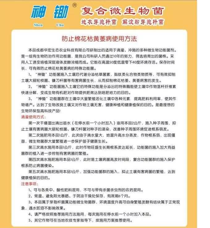 最近,棉花枯黃萎病縈繞在棉農(nóng)的心間,看看地里的棉花一天天的變樣,內(nèi)心充滿了焦慮!福音來了,新疆海文農(nóng)科代理的成都華宏微生物菌肥——神鋤,枯黃萎病的克星。