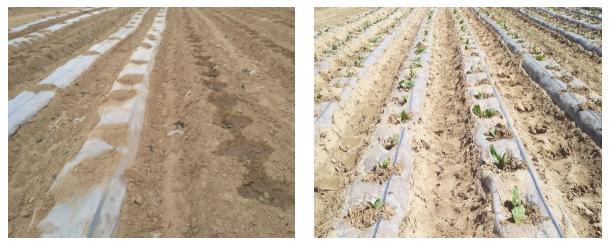 在有列當(dāng)危害嚴(yán)重的煙田規(guī)劃出10畝地進(jìn)行試驗(yàn)。設(shè)2個(gè)處理,處理滴灌施用神鋤生物菌肥,鹽堿土壤調(diào)理劑,噴施氨基酸葉面肥;處理二:只滴灌不施用任何藥劑。