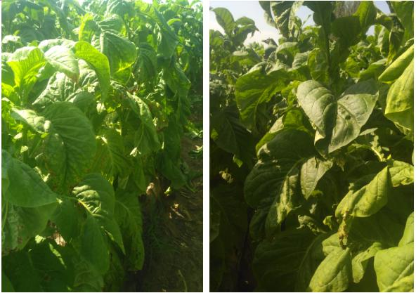 從圖10可以看出,成熟期不施用藥劑的煙株受到列當(dāng)影響逐漸嚴(yán)重,后期煙株已經(jīng)萎縮,而施用藥劑的煙株也有缺鉀的現(xiàn)象但未對(duì)煙株造成影響,也開(kāi)始分層落黃。