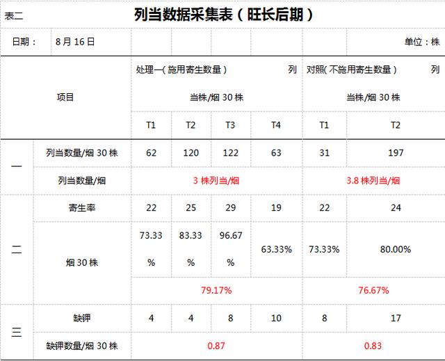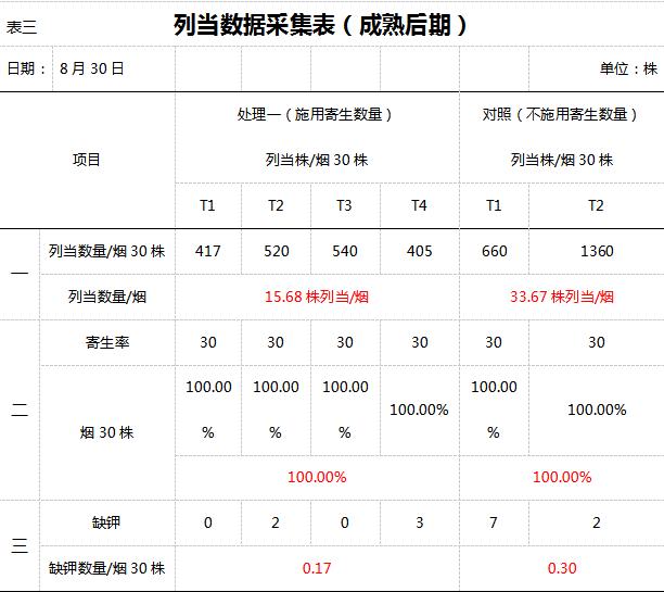 從圖12、表二可以看出成熟后期列當(dāng)對(duì)煙株的影響差異明顯,煙株萎縮嚴(yán)重,通過(guò)數(shù)據(jù)調(diào)查施用煙株寄生數(shù)量、缺鉀株數(shù)明顯少于對(duì)照,但這個(gè)時(shí)期已經(jīng)到了列當(dāng)生長(zhǎng)的高峰期,寄生率都是百分之百。