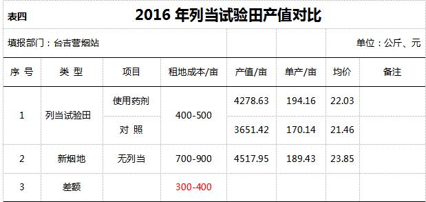 從表四、表五可以看出使用藥劑畝產(chǎn)值高于對(duì)照627.21元,單產(chǎn)也高于對(duì)照24.02kg,而使用藥劑跟臺(tái)吉營(yíng)片區(qū)平均產(chǎn)值4517.95元對(duì)比,也只相差239.32元,每畝藥劑成本348.00,租地成本加藥劑成本與無(wú)列當(dāng)煙地租金接近,所以不使用藥劑的煙田列當(dāng)對(duì)產(chǎn)值影響超過(guò)20%,而施用藥劑的對(duì)其影響降到了5%。