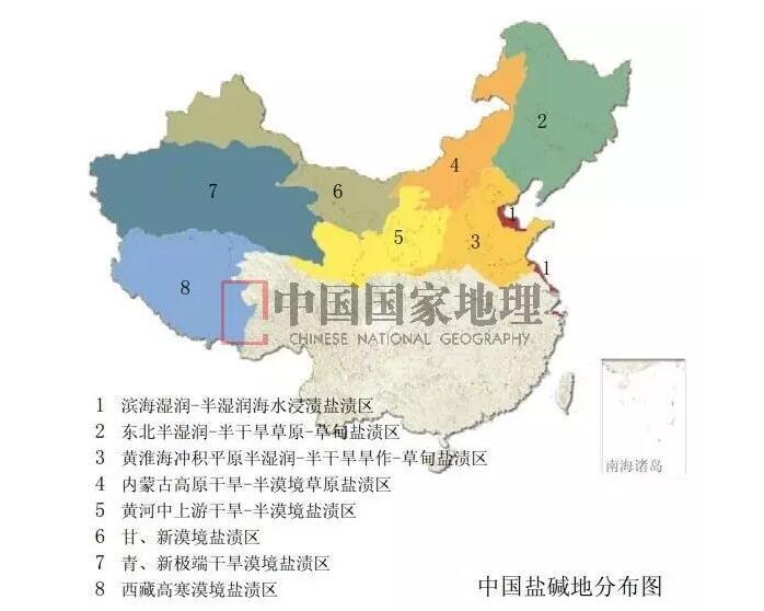 2 地理?xiàng)l件:地形部位高低對(duì)鹽堿土的形成影響很大,地形高低直接影響地表水和地下水的運(yùn)動(dòng),也就與鹽分的移動(dòng)和積聚有密切關(guān)系,從大地形看,水溶性鹽隨水從高處向低處移動(dòng),在低洼地帶積聚。鹽堿土主要分布在內(nèi)陸盆地、山間洼地和平坦排水不暢的平原區(qū),如松遼平原。從小地形(局部范圍內(nèi))來(lái)看,土壤積鹽情況與大地形正相反,鹽分往往積聚在局部的小凸處。我國(guó)鹽堿地分布圖如下圖示。