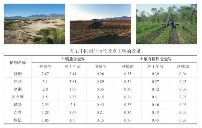 種植一些耐鹽堿植物,在利用植物降低水分蒸發(fā)的同時(shí)通過(guò)植物回收鹽堿地土壤中的鹽分。種植耐鹽堿地植物后重鹽土含鹽量會(huì)有所降低,有試驗(yàn)結(jié)果表明每公頃的鹽地堿蓬和堿爪爪每年可以從鹽堿土中分別吸收2294.6kg和2792.7kg的鹽分(NaCl);灌木樹種白刺,基本上可以降低土壤表層鹽分50%~70%。